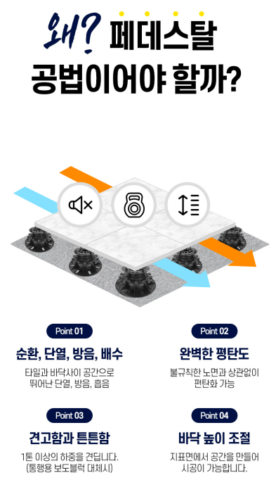 페데스탈 시스템은 바닥 방수층에서 일정 간격을 띄워 지지함으로써 원활한 배수 및 유지보수, 배관, 배성 등의 공간을 확보해주면서 품격 높은 건축물을 시공합니다.