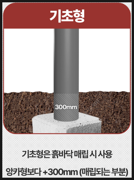 - 앙카형보다 더 긴 기둥을 사용하여 기초석과 연결 후 땅에 묻어 고정합니다.